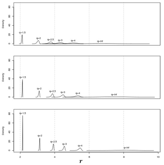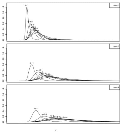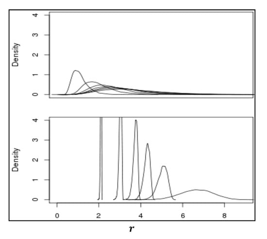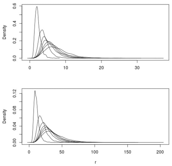 (upper Figure) and the case where the rates all have unit value and only the weights are Poisson distributed (lower Figure). Each of the pdfs in the upper Figure are scaled by the associated