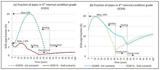 The ICG5 pipes fraction in the accelerated-rehabilitation scenario (1.85% rehabilitation rate) will reduce to 2% during the first 5 years as the deterioration rate of the ICG4 pipes turning into the ICG5 pipes is lower than the replacement rate of the ICG5 pipes with new pipes i.e., ICG1 pipes. After 5 years, this trend is reversed and the ICG5 pipes fraction increase to reach the initial 2.8% level in year 15. In year 25, the fraction of ICG5 pipes are reduced to less than 1.85% of the network length. Therefore, the model starts to renovate ICG4 pipes to fill-up the annual rehabilitation capacity. The fraction of ICG4 and ICG5 pipes reach their lowest level at year 40. After 40 years, the infrastructure backlog is eliminated and steady state is achieved i.e., all ICG5 and ICG4 pipes are replaced annually until the end of the simulation period of 100 years.