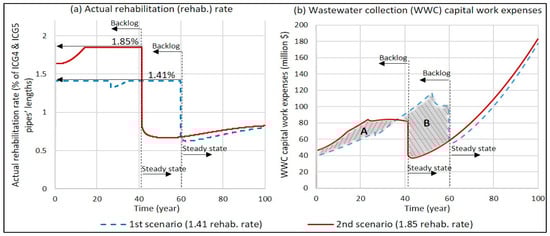 As shown in Figure 2a, the highest rehabilitation rate of 1.85% in the second scenario is achieved after about 15 years and concludes in about year 40, at the onset of the steady-state. In the first scenario, the base-line rehabilitation rate of 1.41% starts from the initial year and continues for about 60 years until it joins the same steady-state of the second scenario.
