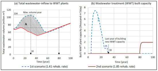 The annual total wastewater-inflow volume and the built treatment plants capacities in each scenario are presented in Figure 3a,b respectively. The annual wastewater volume in the base-line scenario increases for about 30 years until it reaches its maximum level of 104 million m3/day. In the second scenario, the annual wastewater volume will not exceed the initial level until year 80. In Figure 3a, the additional wastewater volume that requires building WWT plant capacity in the first scenario is hatched (area denoted as ‘A’).