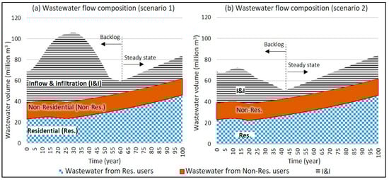The volumes of wastewater generated by residential and non-residential users are relatively identical in both scenarios, and water conservation has a negligible impact on total wastewater flow volumes. In the first scenario, only the extraneous I&I flow volume will impose building extra wastewater treatment capacity in the first 35 years (Figure 3a); whereas, in the second scenario, the population growth will result in increased sewage volume by residential that will result in building increased WWT plant capacity after 80 years.