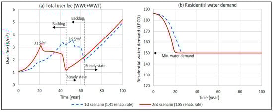 Figure 5 shows the total user fee in Figure 5a and the water demands in Figure 5b for residential users. The user fees are presented based on the present dollar value. The user fee in the first scenario increases to reach its peak value of 3.5 $/m3 in year 50, whereas in the second scenario, the user fee reaches its highest value, 3.1 $/m3, in about year 22.