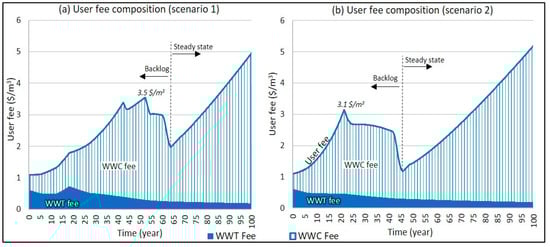 Figure 6 presents the disaggregate WWT and WWC fees for residential users in each scenario. Comparing the WWC and WWT fees highlights the significance of WWC fees in user fee variations. In the first scenario, Figure 6a, the contribution of WWT fees is significant for the first 20 years and then starts to diminish over time. In the second scenario, Figure 6b, the WWT fee contribution decreases from the beginning, up to the end of the simulation when the user fees reach about their maximum, 5 $/m2, in both scenarios.