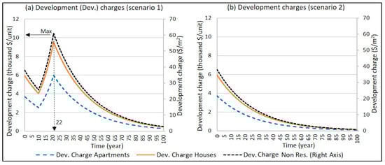Figure 7 shows the changes in development charges based on the present dollar value. In the first scenario, the development charges will start to increase from year 10 and reach their highest value of approximately $5000 for new apartments, $10,000 for new houses, and $60/m2 for new non-residential buildings in year 22. After the year 22, the utility can generate enough revenues to pay for both operational and capital expenses, and the development charges continuously depreciate to reach to the lowest values of $439 for new houses, $274 for new apartments, and $2.81/m2 for non-residential developments at the end of the simulation period. In contrast, the development charges in the second scenario continuously depreciate from the beginning and reach less than $1000 for new residential units and $5/m2 for non-residential developments in year 50.