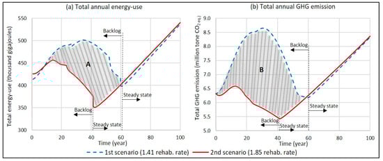 The annual energy-use and GHG emission results are presented in Figure 8a,b, respectively. The annual energy-use in the first scenario is slightly lower than that in the second scenario until about year 10, and it reaches 500 gigajoules/yr in about year 35. The energy-use in the second scenario reaches about 450 gigajoules/yr in about year 15 and starts to decline to as low as 350 gigajoules/yr in the second scenario in about year 40. A similar comparison is attainable for the annual GHG emission results. The annual total GHG emission in the first scenario rises to above 8.5 million tones CO2 eq. in about year 35, whereas it drops to below 5.5 million tones CO2 eq. in the second scenario in about year 40. Hatched area ‘A’ and ‘B’ represent the additional total energy-use and GHG emissions result from implementing the 1.41 baseline rehabilitation rate scenario.