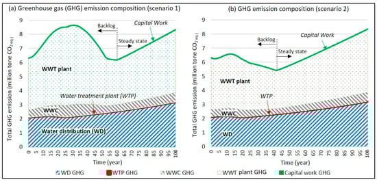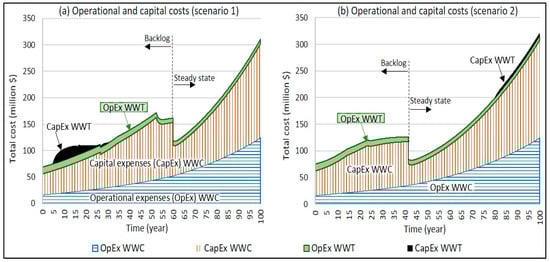 The built WWT capacity presented in Figure 3b corresponds with the WWT plant’s annual wastewater-inflow volume. In the first scenario, the increased wastewater-inflow volume imposes the need to build additional treatment capacities from the initial years until year 30 (when the wastewater volume is at its maximum level), whereas in the second scenario, this need does not arise until about year 80.
