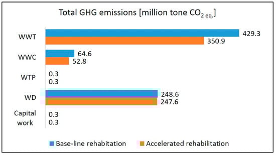 Aggregated GHG emission results, presented in Figure 10, illustrate that the largest GHG emissions are attributed to the water distribution and WWT plant processes; whereas, the GHG emissions from capital work and WTP processes have negligible contribution to the total GHG emissions.