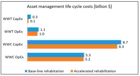 Figure 11 is presented to compare the total annual operational and capital expenses of WWC pipe network and treatment plant systems, based on the present dollar value, when base-line and accelerated rehabilitation strategies are implemented. The capital expenses of WWC systems are the main variable in the asset management costs in both scenarios. For the first 40 and 57 years of the asset life cycle, respectively in the first and second scenarios, capital expenses are the highest cost to the WWC and WWT systems and represent the infrastructure backlog needed to bring the assets to a state of good repair. Later, the operational expenses of WWC systems become more significant than the capital expenses toward the end of the asset’s service life.