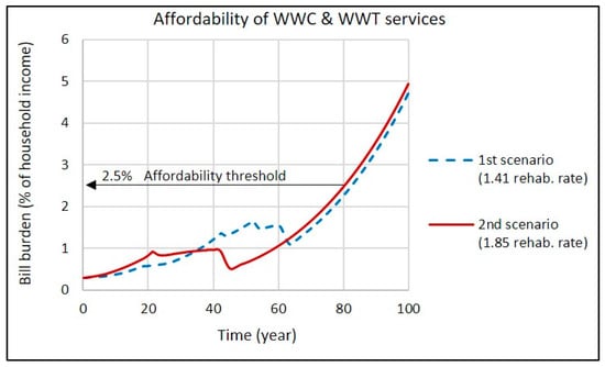 Figure 13 present the affordability results for residential service users. The affordability or bill burden, which represents the percentage of annual average household income paid for wastewater collection and treatment services, stays below the 2.5% affordability threshold [23] until year 80 under both scenarios. In the second scenario, this social sustainability indicator stays below 1% for about 60 years until it increases to nearly 5% at the end of the simulation period. In contrast, in the first scenario, affordability passes 1% after 35 years and increases steadily each year until it reaches the same trend as the second scenario in about year 65. The average affordability ratio for the first and second scenarios are 1.52% and 1.49% respectively.