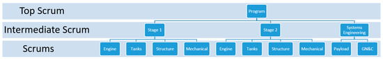For the launch vehicle design simulation, the agents were arranged in a hierarchical structure representing the teams that build the various parts of the launch vehicle. There was an intermediate-level scrum team for Stage 1 with scrums developing the engine, propellant tanks, structure, and defining requirements. Another intermediate-level scrum was for the second stage with similar scrums as the first stage. There was also a third intermediate-level scrum that defined the payload and mission profile with a single scrum. Each of the scrums had a lead that participated in planning and performing the design work. There was also an overall lead for the design effort. Each of these individuals was represented as an agent. Each sub-team had eight members based on recommendations for the size of scrum teams [32]. This organization is shown in Figure 4 below with the groups in the Scrum of Scrums shown horizontally across the organization. The same structure was used in the waterfall simulation as well. The top scrum group, along with the intermediate scrum group, set the initial goals for the project and monitor progress. The lowest “Scrums” group is where actual design work is performed. In the scrum simulation, the intermediate and top scrums had minimal participation in the design work, per scrum guidance [32]. In the waterfall simulation, the intermediate and top scrums were more involved and participated in the lower-level design work.
