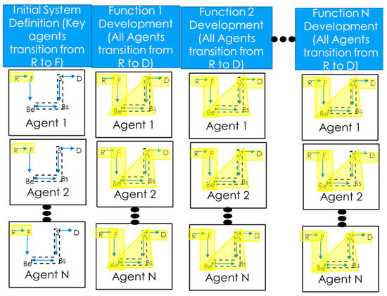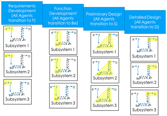 Figure 7 shows the notional Agile process which starts with key agents going through initial system definition by going from the R to the F state. Yellow highlights indicate the FBS state transition that corresponds to the step in the process that the designer is in. Lower-level agents then develop functions in a serial manner by moving through all the FBS states.