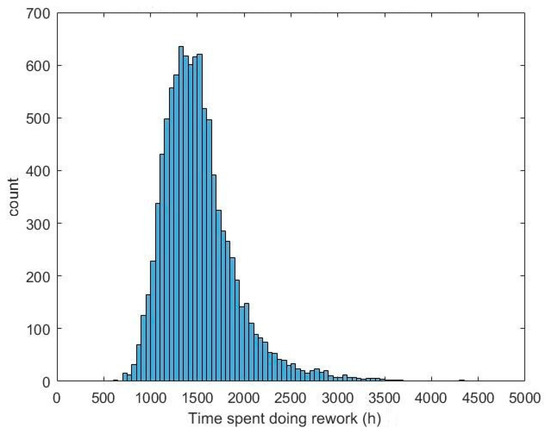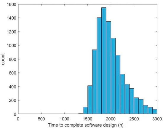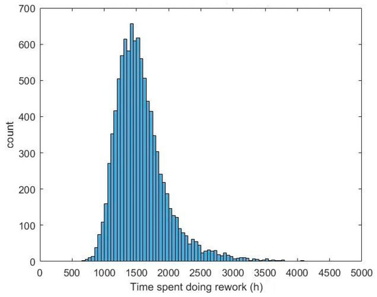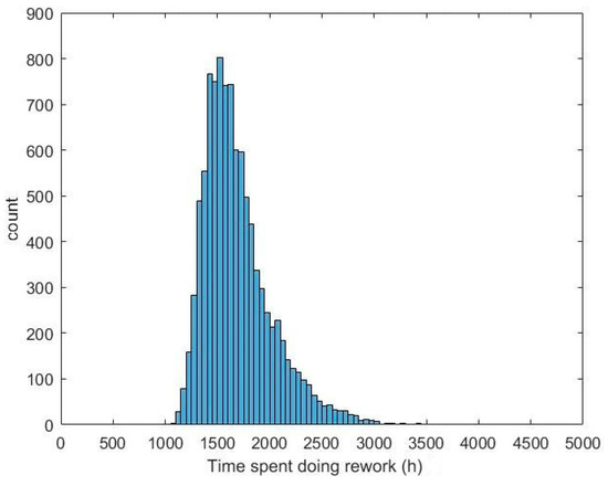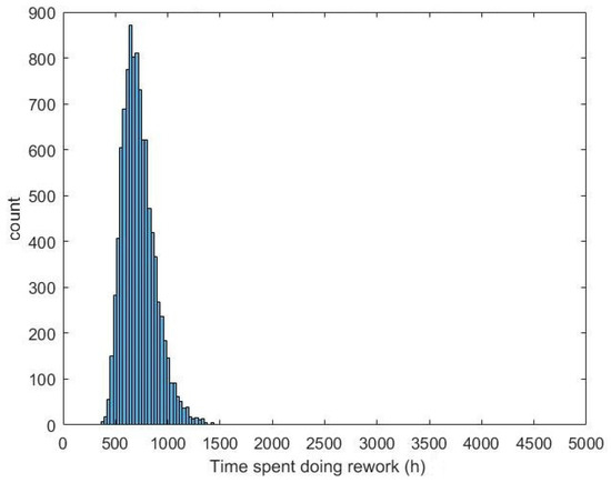 Rework was tracked in the simulation as the amount of time spent performing tasks that were started due to any of the three types of reformulations. Figure 13 shows the amount of rework required to complete the software program design and how it varied across the 10,000 Monte Carlo runs of the software design simulation model. The runs resulted in a mean of 1693 h spent doing rework with a 332 h standard deviation when using a waterfall process.