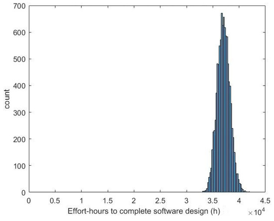 The effort hours, or total number of hours expended by all the agents in the simulation, to complete the design when using a waterfall process across the 10,000 Monte Carlo runs is shown in Figure 17. The data had a mean of 22,846 h and a relatively low standard deviation of 1693 h. This maintains the characteristic seen in the software design simulation where the amount of effort hours needed to complete the launch vehicle design was relatively consistent between the Monte Carlo runs.