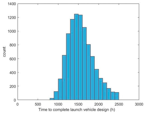 The launch vehicle development simulation produced results from 10,000 Monte Carlo runs for both waterfall and Agile processes. The time needed to complete the launch vehicle design using waterfall development processes is shown in Figure 15. The mean of this data was 1836 h, or roughly 10.5 months of time to complete the design of a simple launch vehicle. The standard deviation of the data was 405 h.