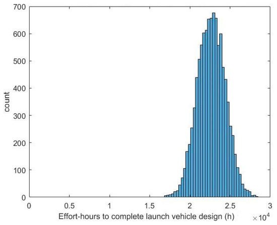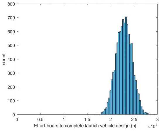 Histogram of effort hours needed to complete a launch vehicle design using a waterfall process.