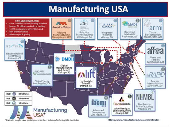 - Manufacturing USA Map of Institutes, National Institute of Standards and Technology (NIST). Available online: https://defenseinnovationmarketplace.dtic.mil/map-manufacturing-usa/ (accessed on 27 June 2019).