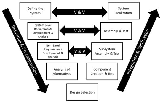 The Vee Model (Figure 4) is often used to visualize the focus of the systems engineering process during development []. The left side of the Vee illustrates the decomposition of the system into the manageable components with a focus on understanding the purpose of the system, defining the problem, identifying stakeholders and their needs, identifying and considering constraints, performing tradeoffs, and the creation of well-developed system requirements.
