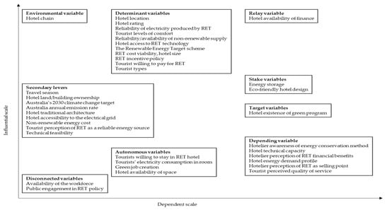 Roles of variables related to the renewable energy technology adoption in the hotel sector in Queensland, based on Impact Matrix Cross-Reference Multiplication Applied to a Classification (MICMAC)’s direct influence and dependence map.