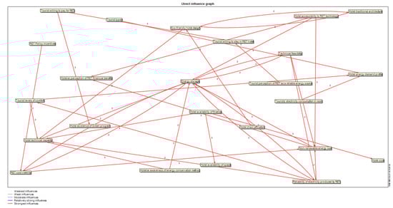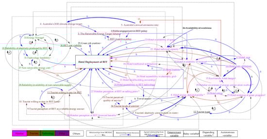 Second, MICMAC maps weak, moderate and strong direct influence relationships between variables. For clarity, Figure 3 displays only strong direct influence relationships. Figure 3 shows 24 variables are strongly related in the Queensland context. Arrows concentrate particularly on energy storage, hotel technical capacity, and non-renewable energy cost. However, MICMAC does not indicate whether the relationships are positive or negative. We used these arrows to draw the CLDs. The CLDs and direct relationships were later discussed with stakeholders.