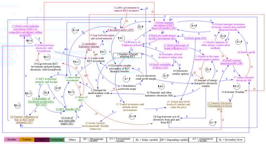 The final CLD for the RET adoption in the hotel sector in Queensland, Australia, developed from the systematic literature review, MICMAC, stakeholder interviews and workshop.