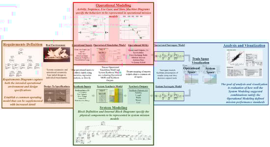 Recent MBSE research, in particular [,,,,], has focused on expanding the conceptualization of MBSE beyond the development of system architecture models utilizing SysML to the development of system synthesis models, operational system models, and tradespace visualization based on an existing system architecture. That work has, often necessarily, restricted model development and analysis to a single demonstration of either a system synthesis system model or an operational simulation model.