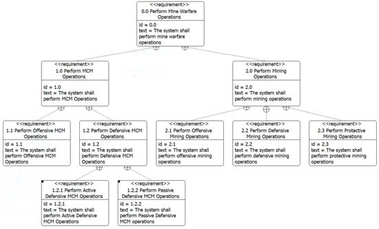 A comprehensive Requirements Diagram communicates a clearly defined problem system boundary, system objectives, and initial system capabilities. The requirements capture the operational environment and design specifications for the system in terms of intended capabilities, expected functions, and quantified performance conditions. Figure 3 presents an example Requirements Diagram for a conceptual mine warfare (MIW) system (the authors use Vitech CORE for the development of the architecture products; note that an equivalent architecture could be generated in an alternative software package such as MagicDraw, Innoslate, etc., depending on stakeholder preferences). Figure 3 provides a hierarchy of requirements that address “Perform Mine Warfare Operations” and shows the functions that are assigned to each requirement (top half of each box). The quantified performance condition for each requirement is included in the CORE file, but not shown in this graph for the sake of brevity and simplicity.