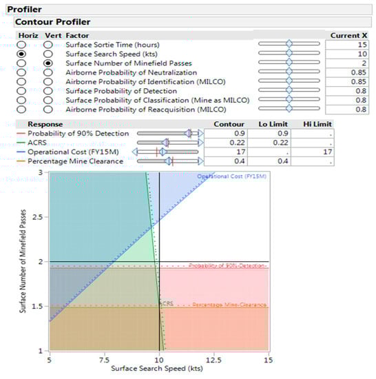 The tradespace approach is particularly useful at communicating that there is not a single acceptable system configuration for executing a mission, rather a feasible set of system configurations are identified. In this example, the crosshairs indicate a potential design point. Note that the system must have a search speed of at least 10 knots if two minefield passes are conducted (design points with a lower speed will be unable to satisfy the constraint for ACRS).
