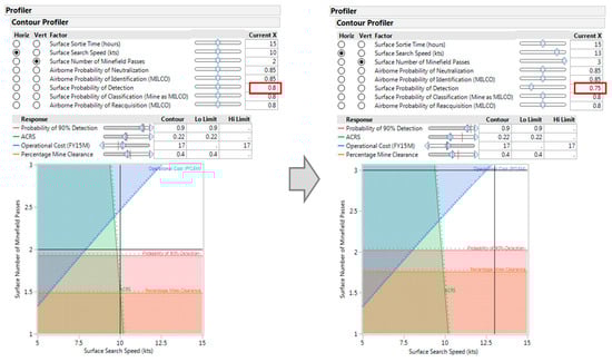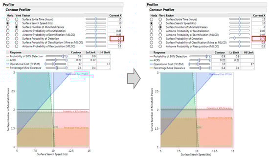 While this is an instructive example of the challenges that can arise as a result of alterations to system configuration, the tradespace exploration approach also suggests multiple potential solutions. Figure 8 presents an example of a solution that is easily apparent and focused on mission implementation: the system that is made infeasible by the reduction in sonar probability of detection to 0.75 becomes feasible again when the mission is changed to increase the number of minefield passes from 2 to 3.