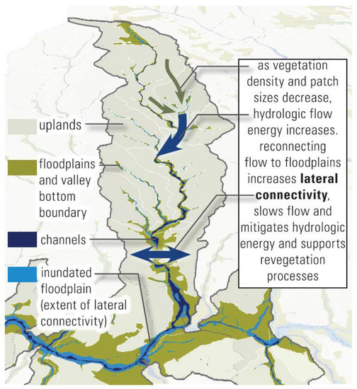 A critical driver of watershed conditions are the connectivity conditions of valley bottoms where water and other flows are concentrated throughout the watershed. When hydrologists refer to hydrologic connectivity, they are often referring to longitudinal connectivity, i.e., how fast flow proceeds to the watershed outlet [30]. An overall restoration strategy is to increase lateral connectivity, whereby channel flows are connected and able to flow laterally onto the adjacent floodplains [35]. This reconnection of the flow to the floodplain can address the extensive problem of increased hydrologic energy with scouring peaks of flow, as shown in Figure 1. More of the watershed would serve as a runoff sink, and less as a runoff source, with more water retained and overall storage increased [36]. An increase in lateral connectivity throughout a watershed increases the area of runoff sinks by spreading and slowing the flow, recharging soil storage capacity, and supporting vegetation productivity. Vegetation then provides the feedback function of increasing infiltration and water holding storage capacity through increasing surface roughness, introducing soil pathways, and increasing organic matter into the soil [37].