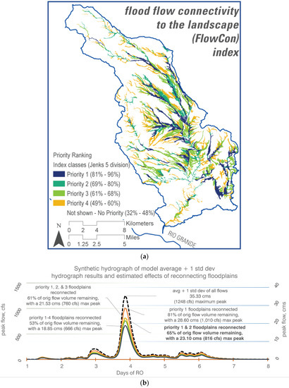 Outputs of the Flood Flow Connectivity to the Landscape (FlowCon) modeling framework that contributed to the generalizable and adaptable integrative socio-environmental system dynamics (SD) model addressed in this article. FlowCon identifies optimum locations and quantifies the resulting benefits and extent of management and collaborative support required for restoration of the critical landscape processes of reducing hydrologic energy through increasing water retention, recharge, and vegetative productivity. (a) Locations for reconnecting floodplains at varying priority levels; (b) effects on a synthetic hydrograph of executing the various levels. The top two priority levels were found to be the optimum levels for reversing degradation trends.