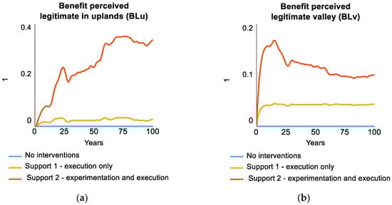 Benefits realized by local land managers in the upland systems (a) and the valley systems (b). Three scenarios are shown in the results beginning in this Figure: “No interventions” which represents the base case scenario with no additional flow connectivity management, “Support 1—execution only” which represents outside financial support to execute the new practices on a wider scale quickly, and “Support 2—experimentation and execution” which represents additional support for a phase of experimentation for a better fit to the local conditions to realize productivity benefits more quickly and to a greater extent, which leads to a perception of greater legitimacy of the practices.