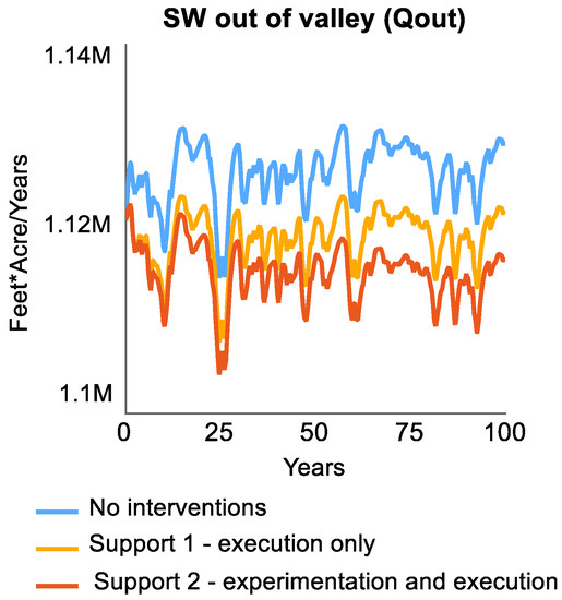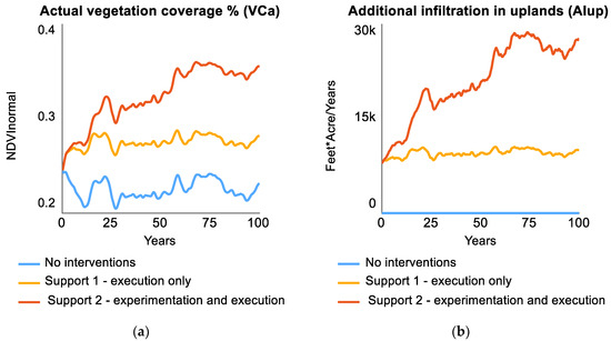 Support for managing flow connectivity to the landscape is provided by two functions, direct support to execute the new interventions and management, and support to managers to experiment with fitting the practices to their local conditions, thereby realizing more productivity benefits directly from the interventions. Three scenarios are shown in the results beginning in Figure 8: “No interventions” which represents the base case scenario with no additional flow connectivity management, “Support 1—execution only” which represents outside financial support to execute the new practices on a wider scale quickly, and “Support 2—experimentation and execution” which represents additional support for a phase of experimentation for a better fit to the local conditions to realize productivity benefits more quickly and to a greater extent, which leads to a perception of greater legitimacy of the practices. More upland interventions reduce the stormwater available for valley practices; thus, a tradeoff is that productivity benefits decrease in the valley with increased benefits in the uplands.