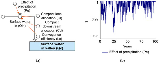 Generally, agriculture does not take advantage of stormwater flows, often due to water rights limitations, which are typically limited to the quantities of water distributed from reservoirs through water compact agreements. This model includes a dual system of stormwater and traditional use, whereby compact allocations drive the distribution of surface water upstream from the system, as shown in Figure 15. These allocations are affected by upstream precipitation/snowpack variability, where any quantity below a mean level set by the compact agreement reduces the allocation, as shown in Figure 15b.