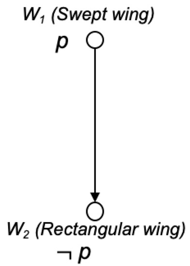 From the definition of “prefers” represented in Equation (5), the above equation means that p is preferred if and only if all worlds at which p is true are considered at least as good as worlds where it is false. Figure 1 represents a preference structure for which this preference statement evaluates to true. It shows the worlds of S along with a list of propositions true at each world. The arrows in Figure 1 represent the betterness relation with a total order, i.e., . It should be noted that, for convenience, edges from a world () into itself (representing the fact that are not shown throughout the paper. This is the only structure for which the given preference evaluates as true, and so it is the only ordering of the design space consistent with the stakeholder’s preference. It happens to contain a greatest element, w1 (swept wing), which would thus be the preferred choice of the decision-maker.