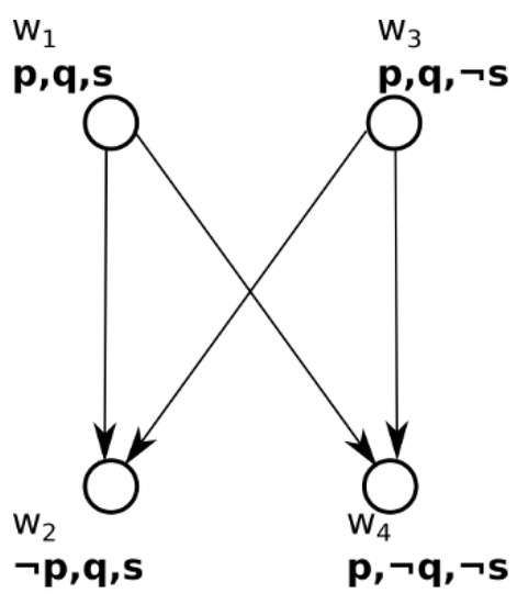 Equation (8) means that the decision-maker prefers worlds where p is true (over those where it is not). Equation (9) means that the decision-maker prefers worlds where q is true to worlds where p is true. The diagram in Figure 2 depicts one preference structure, that satisfies these preferences. The arrows in Figure 2 represent the betterness relation . From Figure 2., it can be seen that , and . The intention here is to find the greatest element (optimal solution—Definition 12) with respect to the betterness relation. World is the greatest in this case.