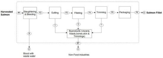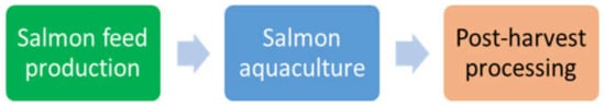 The aquaculture production sector in Norway is regulated toward profitability, competitiveness and sustainable development []. The framed salmon value chain starts from salmon feed production used for salmon aquaculture and finally, the PHPS of the harvested salmon, as Figure 1 demonstrates.