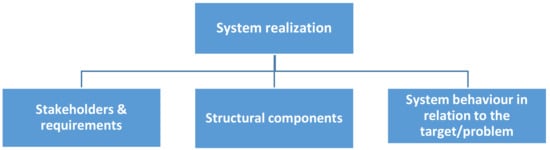The system’s interacting functions and elements require a holistic evaluation of the variations in the system’s structure []. Systems are a collection of hardware, software, people, facilities, and procedures organized to accomplish some common objectives that stakeholders of the system are interested in [,]. Systems engineering principles can guide toward understanding an industrial system and gain insight into its structure and behavior []. System engineering allows to address the system’s interacting elements in relation to the targeted problem or quested development. The understanding of a comprehensive system requires: recognizing the multidisciplinary nature of the system’s components, defining the stakeholders who contribute to the decisions that direct the system, and describing the system’s behavioral dynamics. Analytical system understanding will help in problem formulation, revealing its causes, suggesting actionable measures, and the reassessment for the efficiency and consequences of the applied set of measures. In summary, a system engineering framework structured based on the three main concepts of requirements, behaviors, and structures [] expected to result from the system functional configuration in Figure 2.