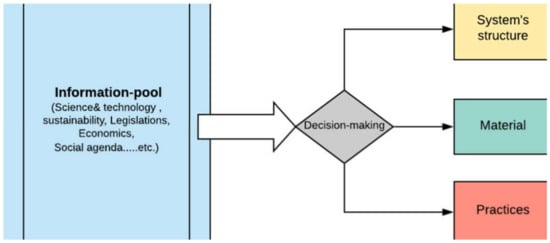 A system’s behavior is the materialization of the assembled structural components, and a descriptive term for the outcome performance, results and choice of practices. A system’s form and operations are based on numerous decisions made to insure the system’s functionality []. A system’s decisions are always based on information; the background collective knowledge that shapes the system, defines the flowing material and governs the system’s actions (Figure 4).