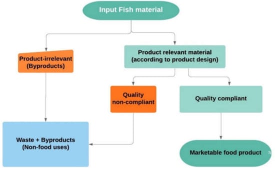 System’s behavior: The system’s behavioral attitude toward the material is driven by product design. As the final product will be Salmon fillet, it considers the blood, head, skin, fins, bones and viscera as excluded material. During processing strict quality control, standards and food safety restrictions applied on the material, any material that is found to be not compliant for any reason will be excluded and marked out as scrap material (Figure 6). The salmon PHPS made a shift from being heavily manual labor-based to automation of the processing lines applying modern technology [,]. Automation increased the production rate and efficiency with the material, reducing the amount of scrap or delay-caused-spoilage. In the process of Salmon fillet production, the estimated ratio of the extracted marketable product compared to the input harvested biomass could reach 50% in most optimum conditions, leaving the other excluded 50% of the biomass out as a waste material that is being managed to eliminate its environmental consequences and slightly recover part of its costs. A fundamental question arises: why does this study see this excluded material of heads, skin, blood, viscera and trimmings as food being lost? The answer is because of its significant load of nutrients and its absence of any extraordinary hazards. These fish organs and remaining raw material are eaten by people in certain markets and culinary cultures [].