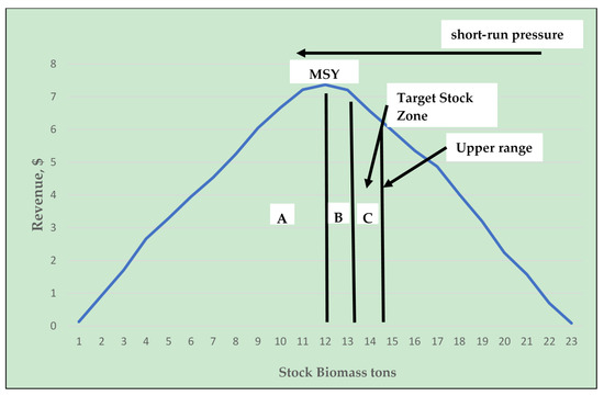 Figure 1 shows a generalized graph of revenue across different levels of stock biomass based on the biomass dynamic model [35]. The region left of the MSY, labeled A, is dangerous because fishing pressure can lead to reinforcing feedback where harvests can drift above sustainable fishery output leading to lower stock biomass and less recruitment and less biomass growth. If feedback on fishery health is delayed or inaccurate, the fishery can spiral out of control and lead to a stock crash. In addition, natural environmental fluctuations can also send the fishery into collapse. Climate change adds to the uncertainty because of the many unknown impacts to ecosystems and subsequent adaptive responses [3]. The only sensible goal is to allow for natural insurance, create a buffer as a lower stock target, labeled B, and create a target stock zone, labeled C, in Figure 1. Unfortunately, there are short-run pressures in the system to increase catch rates and push the biomass toward lower and thus, riskier levels.