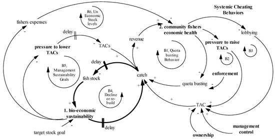 In an ITQ fishery, a TAC is set as an overall limit to fishery catch. The individual transferable quota (ITQ) is then divided up among the participants in some fashion, as a percentage of the TAC. In this diagram, we use quota in a general sense, as information feedback that influences participant behavior. In the case of a fishery where stock rebuilding is necessary, we can trace the causal influences starting with a decreasing bio-economic sustainability (labeled “1. Bio-economic sustainability,” Figure 2) relative to a target stock goal (see [8]). A decreasing bio-economic sustainability would then lead to an increase in pressure to lower quotas, then to a decrease in quotas, leading to a decrease in catch, then to an increase in the fish stock, leading finally to an increase in bio-economic sustainability. In essence, we can see fishery management’s response to this problem or gap between the desired and actual state by tracing through this causal path.