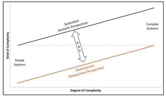 A key insight on how to gain more understanding about teaching systems thinking is by identifying the cognitive gap that exists between reductionism and systemism in dealing with increasing degrees and kinds of complexity as depicted in Figure 1. Kind of complexity refers to different kinds of systems, from simple systems like atoms and molecules to complex systems like solar systems and galaxies, which are differentiated based on properties that higher-level systems have that their parts do not (i.e., emergent properties) []. Degree of complexity refers to the number of parts in a system and the interactions between those parts, therefore as the number of parts and interactions increase so does the degree of complexity []. For example, a planet and a solar system differ in kind and degree of complexity. A solar system comprises many planets and other parts and has properties that the planets individually do not have, making it a different kind of system. Additionally, a solar system has a greater degree of complexity than a planet due to the greater number of parts and interactions between parts.