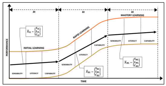 Within each phase i, the systems thinking learning process goes through the three systems thinking learning levels of sensibility (S), literacy (L), and capability (C). All three levels are present concurrently during the systems thinking learning process. Therefore, a learner’s path through each phase depends on a combination of all three levels. Performance (X), or learning, in each phase i can be measured as: