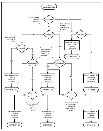 The remaining patterns of (3) elements being critical to the system definition, (4) elements being underlying causes of the problem situation, and (5) elements being sub-systems within the greater fish-tank system were used to create three more element classifications. Examining these three patterns revealed a connection to three of the ideas from the content of learning by Ackoff []: data and information, knowledge, and understanding. Elements that are critical to define a fish-tank system represent the essential data or information used to define what type of system is being observed []. Defining essential elements demonstrates an awareness of what elements are necessary to define a system as a fish-tank system. Therefore, a classification to distinguish essential elements from other elements was needed to fully classify elements in a fish-tank system. Elements that are underlying causes of the problem situation or elements that are sub-systems represent an advanced understanding of why a system behaves a certain way []. Defining advanced elements demonstrates an understanding of why elements might be causing the green water problem situation in a fish-tank system. Therefore, a classification to distinguish advanced elements from other elements was needed to fully classify elements in a fish-tank system. Elements that do not meet the essential or advanced classification definitions still contribute knowledge about how a system works []. Defining these secondary elements demonstrates knowledge about the elements needed to explain how the system is working. Therefore, a classification to distinguish secondary elements from other elements was needed to fully classify elements in a fish-tank system. The connections between the five patterns and the seven element classifications are summarized in Table 1.