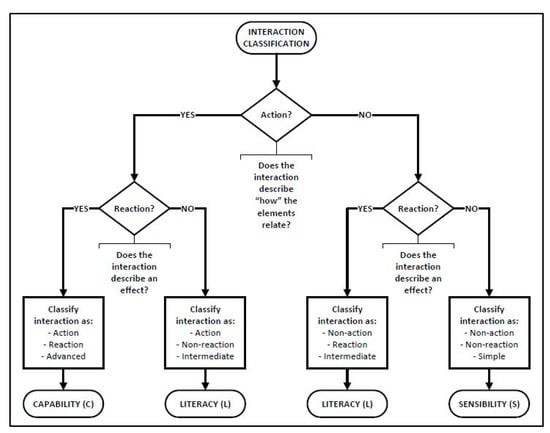 The classification structure could now be used to classify potential interactions identified by students for a fish-tank system. The interaction classification flowchart used during the interaction classification process is presented in Figure 5. While analyzing each drawing, interactions were classified and recorded according to specific rules in preparation for the quantitative analysis. The rules used to classify and record interactions are described in Table A4 in Appendix B.