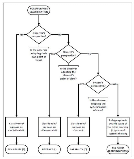 The process of classifying perspectives entailed classifying roles/purposes, which are the result of applying the systems thinking concept of perspectives. In the context of a fish-tank system, it was conceivable to define all the possible roles/purposes for each element. However, defining all of these roles/purposes, like with interactions, was not realistic. Suppose that each of the forty-nine (49) elements defined in Table A1 in Appendix A were assigned a role/purpose from each of the three systems thinking learning levels. This would result in three (3) roles/purposes per element meaning, at a minimum, 147 roles/purposes would need to be defined. Instead of defining an exhaustive list of all potential roles/purposes for each element, the classification structure developed for roles/purposes was based upon the simple patterns necessary to classify all potential roles/purposes that students could conceivably identify for a fish-tank system.