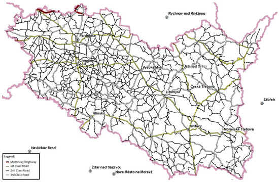 An example of the practical application of the proposed system for identifying regional critical infrastructure elements is demonstrated by a case study that focuses on road infrastructure as a part of the technical infrastructure in the Pardubice Region (NUTS—CZ053), which represents the societal system. The territorial limitation of the assessed region is defined by the borders of the administrative district of the Pardubice Region. The map of the area under consideration is presented in