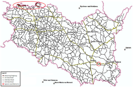 Special level comprises the elements that disable the road infrastructure for levels higher than the regional units (i.e., national level), namely motorway sections and one nationally significant building (tunnel) in the territory of the Pardubice Region. For this reason, these elements also have a significant impact on the elements of adjacent regions. The reason for this may be the fact that the motorway serves mainly for transit traffic between states and their parts. Similarly, the mentioned tunnel forms a significant obstacle to the national transit route. Routes alternative to the tunnel route are unable to provide adequate throughput for the transport capacity. A graphical representation of the special level elements in the evaluated region is presented in