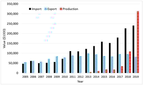 Import and export data of the category of mask products (HS Code: 6307.90-9000) from 2005 to 2019 [11]. Korean won (KW) was converted into the U.S. Dollar based on the average exchange rate from Reference [12]. Production in 2019 was estimated by 3 million masks × 311 days per year × 390 KW per mask.