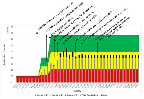 Given the lockdown and travel ban approach carried out in many countries, the estimates of demand for healthcare KF-masks in Korea are shown in Figure 2 with the area graphs of demand of masks and a stacked bar chart of mask supply until August of 2020. Scenario A presents a lockdown approach with the travel ban, while Scenarios B and C demonstrate an open democratic approach. Scenario B is forecasted with very strong social distancing and minimal economic and social activities with limited travels. Scenario C assumes regular daily life as it was. However, if the government sustains an open democratic society and responds to dynamic emergency situations with uncertainty, the country needs over 200 million masks a week, resulting in demand volume for masks 1.5 times more than Scenario B and four times more than Scenario A.